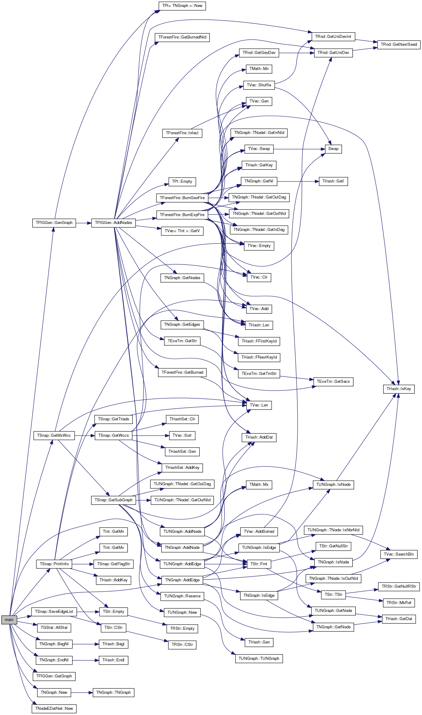 References TNGraph::AddEdge(), TNGraph::AddNode(), TGStat::AllStat(), TNGraph::BegNI(), TNGraph::EndNI(), TFfGGen::GenGraph(), TFfGGen::GetGraph(), TSnap::GetMxWcc(), TNGraph::New(), TNodeEDatNet< TNodeData, TEdgeData >::New(), TSnap::PrintInfo(), TInt::Rnd, and TSnap::SaveEdgeList().