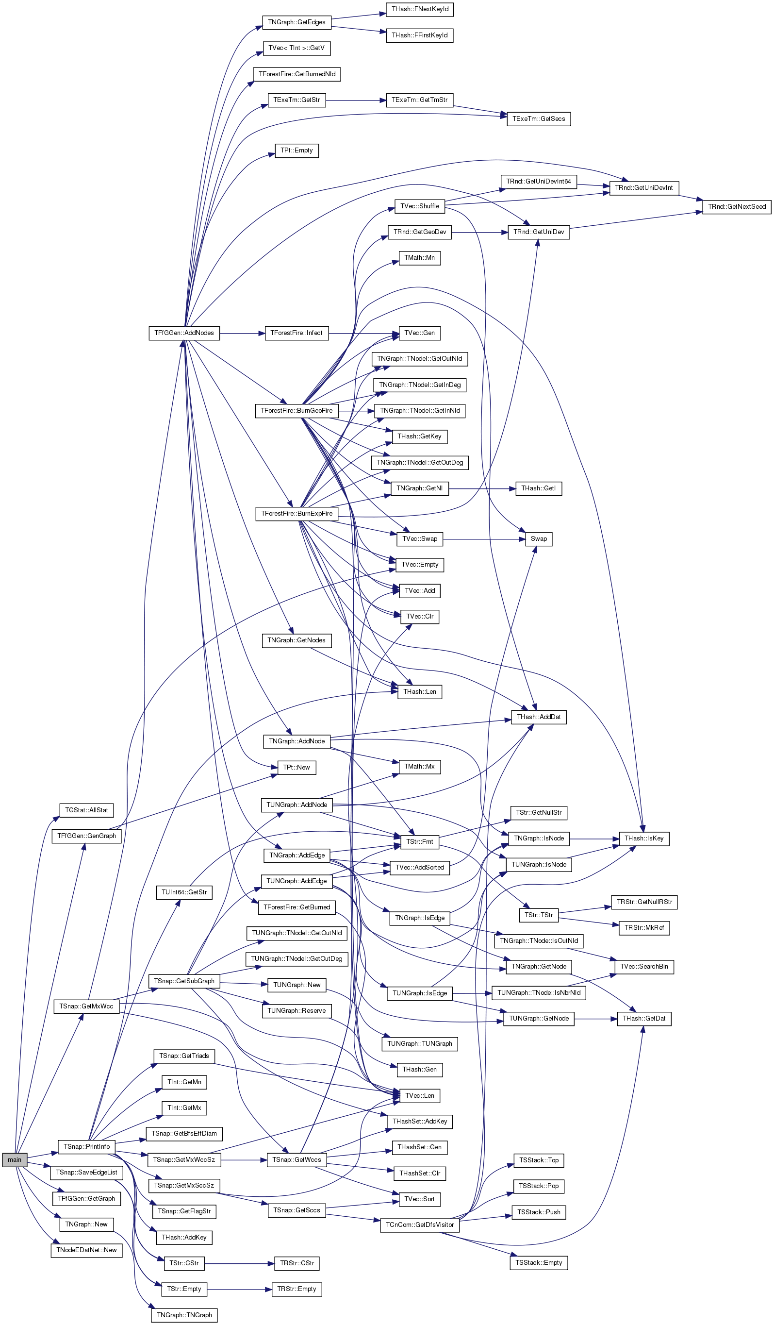 References TGStat::AllStat(), TFfGGen::GenGraph(), TFfGGen::GetGraph(), TSnap::GetMxWcc(), TNGraph::New(), TNodeEDatNet< TNodeData, TEdgeData >::New(), TSnap::PrintInfo(), TInt::Rnd, and TSnap::SaveEdgeList().