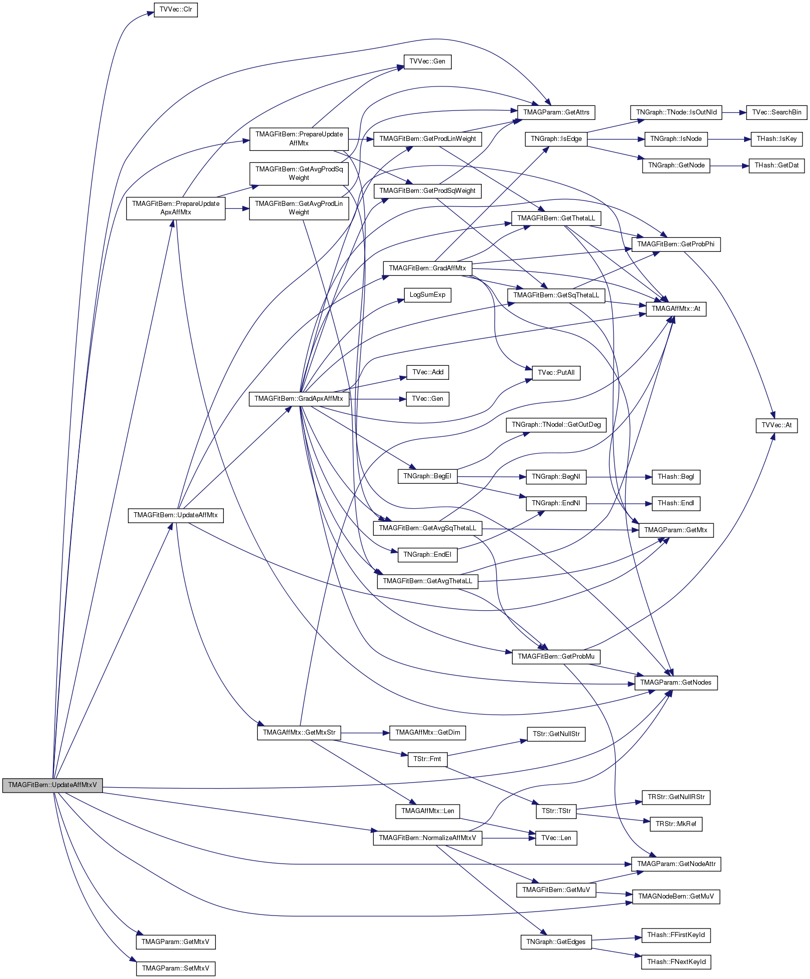 References TVVec< TVal, TSizeTy >::Clr(), TMAGParam< TNodeAttr >::GetAttrs(), TMAGParam< TNodeAttr >::GetMtxV(), TMAGNodeBern::GetMuV(), TMAGParam< TNodeAttr >::GetNodeAttr(), TMAGParam< TNodeAttr >::GetNodes(), MSpeedUp, NormalizeAffMtxV(), Param, PrepareUpdateAffMtx(), PrepareUpdateApxAffMtx(), TMAGParam< TNodeAttr >::SetMtxV(), and UpdateAffMtx().