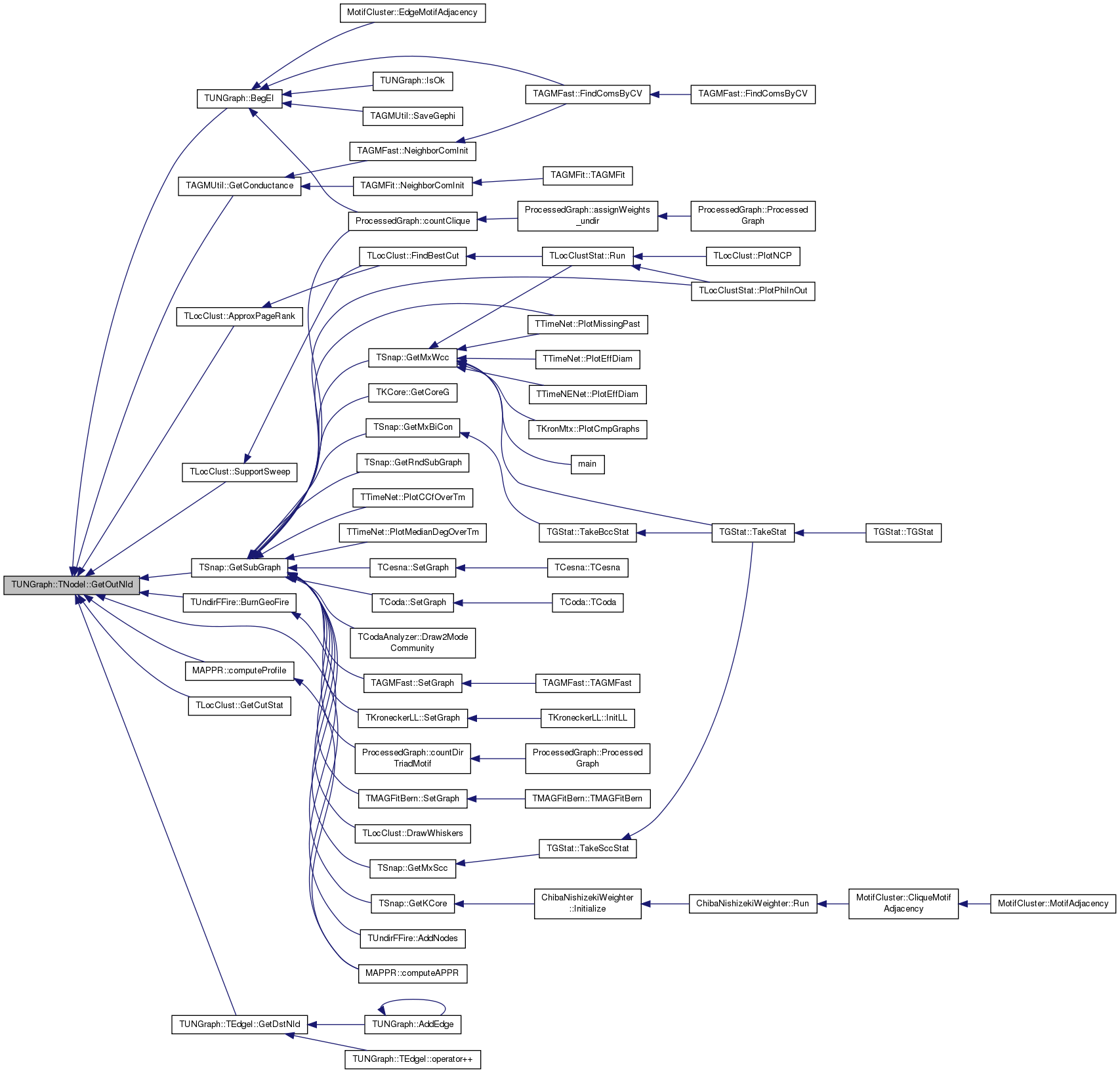 Referenced by TSnap::GetCmnNbrs< PUNGraph >(), TLocClustStat::TCutInfo::GetFracDegOut(), TSnap::GetGroupDegreeCentr(), TAGMUtil::GetNbhCom(), TCliqueOverlap::GetNbrs(), TAGMFast::GradientForOneVar(), TAGMFast::GradientForRow(), TCesna::GradientForRow(), TAGMFast::HessianForOneVar(), TSnap::Infomap(), TSnap::TSnapDetail::InfomapOnlineIncrement(), ChibaNishizekiWeighter::Initialize(), TSnap::Intersect(), TSnap::Intersect1(), TAGMFit::JoinCom(), TAGMFit::LeaveCom(), TAGMFast::LikelihoodForOneVar(), TAGMFast::LikelihoodForRow(), TCesna::LikelihoodForRow(), TSnap::TSnapDetail::MapEquationNew2Modules(), TCliqueOverlap::MaxNbrsInCANDNodeId(), TAGMFast::MLEGradAscent(), TAGMFast::MLEGradAscentParallel(), TCesna::MLEGradAscentParallel(), TAGMFast::MLENewton(), TAGMFast::NeighborComInit(), TAGMFit::NeighborComInit(), TCesna::NeighborComInit(), TAGMFit::RandomInit(), TAGMFit::SeekJoin(), TAGMFit::SeekLeave(), TAGMFit::SeekSwitch(), and MotifCluster::SemicliqueMotifAdjacency().