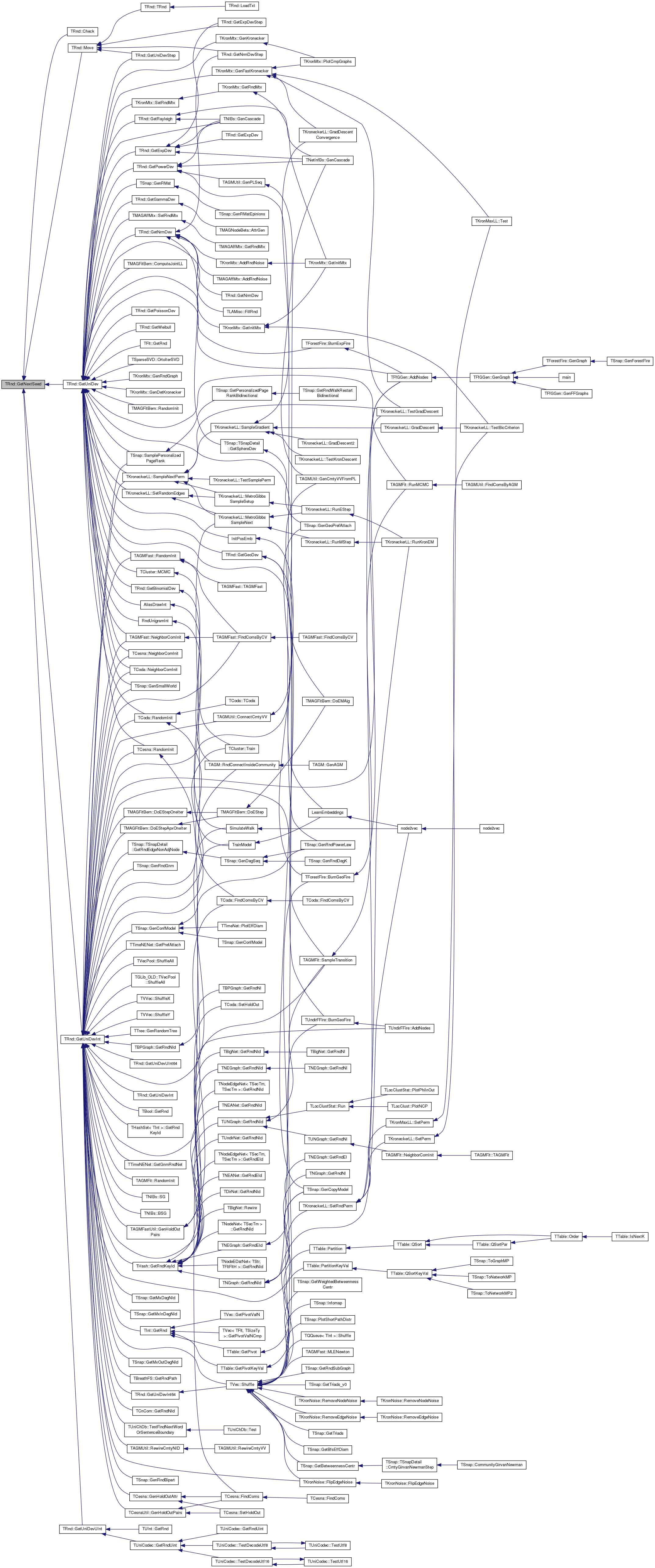 Referenced by TFfGGen::AddNodes(), AliasDrawInt(), TForestFire::BurnExpFire(), TMAGFitBern::ComputeJointLL(), TMAGFitBern::DoEMAlg(), TNIBs::GenCascade(), TSnap::GenCopyModel(), TKronMtx::GenDetKronecker(), TKronMtx::GenFastKronecker(), TKronMtx::GenKronecker(), TSnap::GenRMat(), TKronMtx::GenRndGraph(), TSnap::GenSmallWorld(), GetBinomialDev(), GetExpDev(), GetGammaDev(), GetGeoDev(), TKronMtx::GetInitMtx(), GetNrmDev(), GetPoissonDev(), GetPowerDev(), GetRayleigh(), TFlt::GetRnd(), GetUniDevStep(), GetWeibull(), InitPosEmb(), TCluster::MCMC(), TAGMFast::NeighborComInit(), TCoda::NeighborComInit(), TCesna::NeighborComInit(), TSparseSVD::OrtoIterSVD(), TAGMFast::RandomInit(), TCoda::RandomInit(), TCesna::RandomInit(), TMAGFitBern::RandomInit(), RndUnigramInt(), TAGMFit::RunMCMC(), TKroneckerLL::SampleNextPerm(), TSnap::SamplePersonalizedPageRank(), TKroneckerLL::SetRandomEdges(), TMAGAffMtx::SetRndMtx(), and TKronMtx::SetRndMtx().