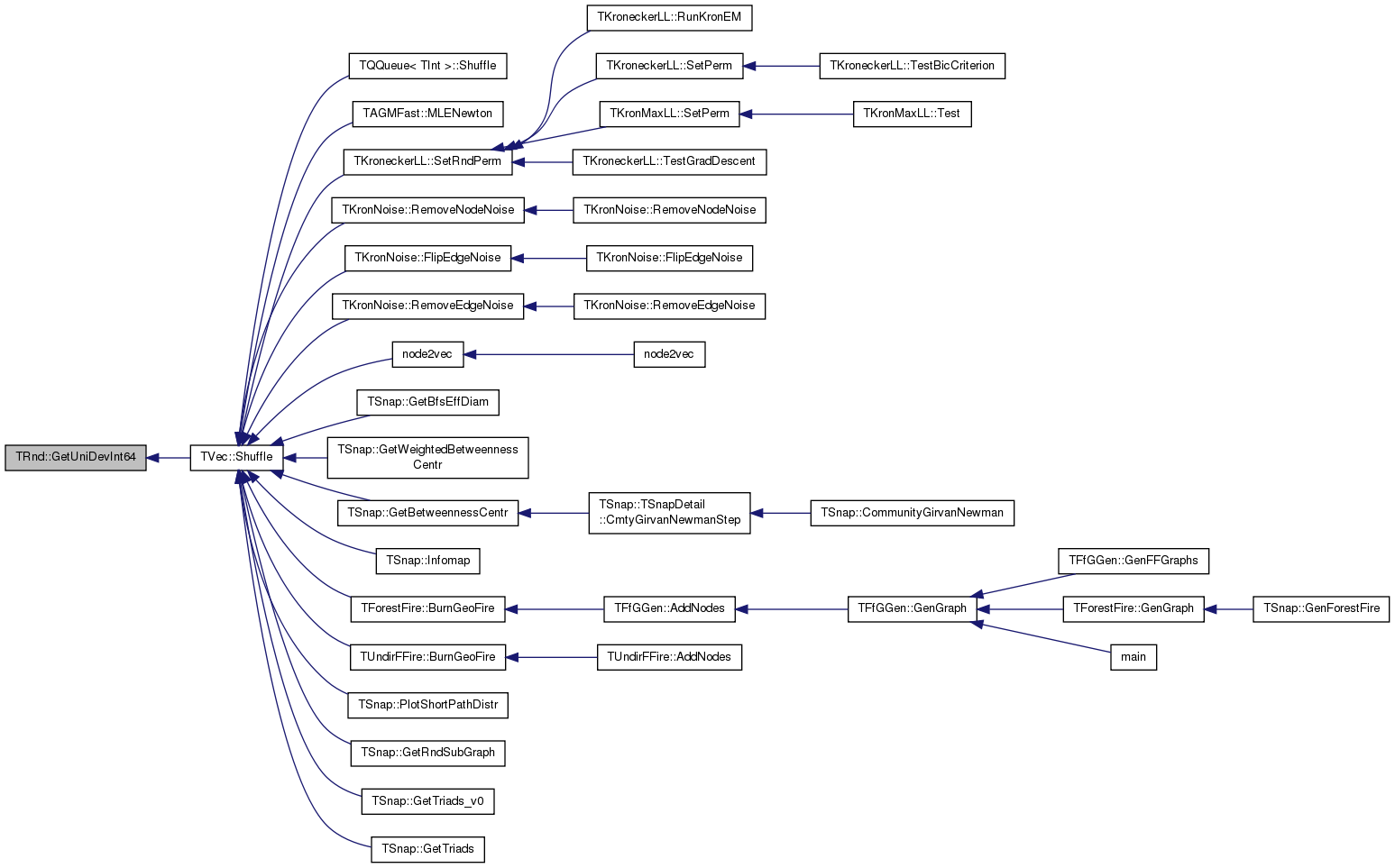 Referenced by TFfGGen::AddNodes(), TUndirFFire::AddNodes(), TNIBs::BSG(), TAGMUtil::ConnectCmtyVV(), TMAGFitBern::DoEStepApxOneIter(), TMAGFitBern::DoEStepOneIter(), TAGMFast::FindComsByCV(), TKronNoise::FlipEdgeNoise(), TSnap::GenConfModel(), TSnap::GenCopyModel(), TSnap::GenGeoPrefAttach(), TCesna::GenHoldOutAttr(), TCesnaUtil::GenHoldOutPairs(), TAGMFastUtil::GenHoldOutPairs(), TTree< TVal >::GenRandomTree(), TSnap::GenRndBipart(), TSnap::GenRndGnm(), TSnap::GenSmallWorld(), TTimeNENet::GetGnmRndNet(), TSnap::GetMxDegNId(), TSnap::GetMxInDegNId(), TSnap::GetMxOutDegNId(), TTimeNENet::GetPrefAttach(), TBool::GetRnd(), TInt::GetRnd(), TSnap::TSnapDetail::GetRndEdgeNonAdjNode(), THash< TKey, TDat, THashFunc >::GetRndKeyId(), THashSet< TInt >::GetRndKeyId(), TCnCom::GetRndNId(), TBPGraph::GetRndNId(), TBreathFS< PGraph >::GetRndPath(), GetUniDevInt(), GetUniDevInt64(), GetUniDevUInt64(), TKroneckerLL::MetroGibbsSampleNext(), TAGMFast::NeighborComInit(), TCoda::NeighborComInit(), TCesna::NeighborComInit(), TAGMFast::RandomInit(), TCoda::RandomInit(), TAGMFit::RandomInit(), TCesna::RandomInit(), TAGMUtil::RewireCmtyNID(), TAGM::RndConnectInsideCommunity(), TKroneckerLL::SampleNextPerm(), TSnap::SamplePersonalizedPageRank(), TAGMFit::SampleTransition(), TNIBs::SG(), TVec< TVal, TSizeTy >::Shuffle(), TVecPool< TVal, TSizeTy >::ShuffleAll(), TGLib_OLD::TVecPool< TVal >::ShuffleAll(), TVVec< TVal, TSizeTy >::ShuffleX(), TVVec< TVal, TSizeTy >::ShuffleY(), SimulateWalk(), TUniChDb::TestFindNextWordOrSentenceBoundary(), TCluster::Train(), and TrainModel().