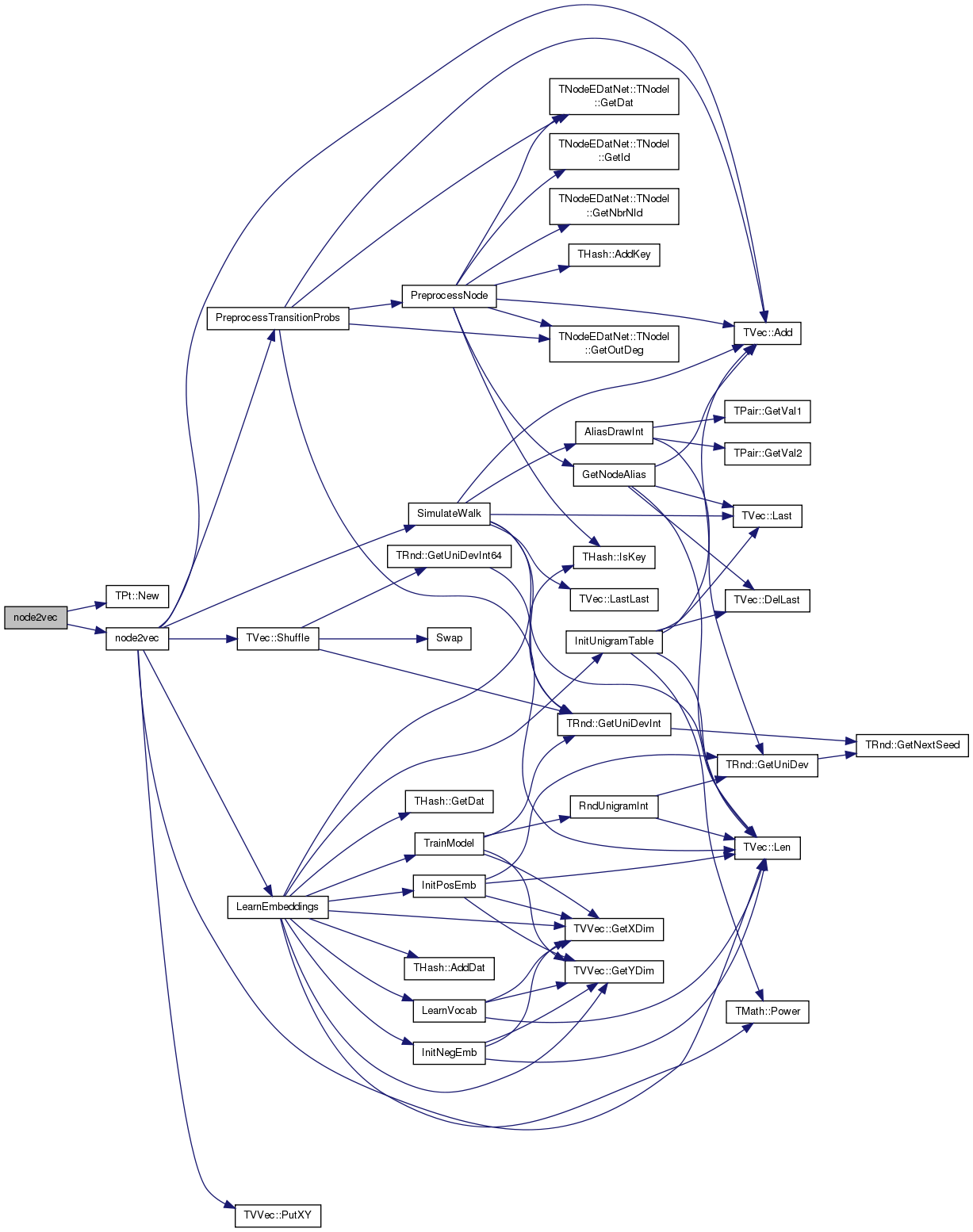 | void | node2vec (PWNet &InNet, const double &ParamP, const double &ParamQ, const int &Dimensions, const int &WalkLen, const int &NumWalks, const int &WinSize, const int &Iter, const bool &Verbose, TIntFltVH &EmbeddingsHV) |