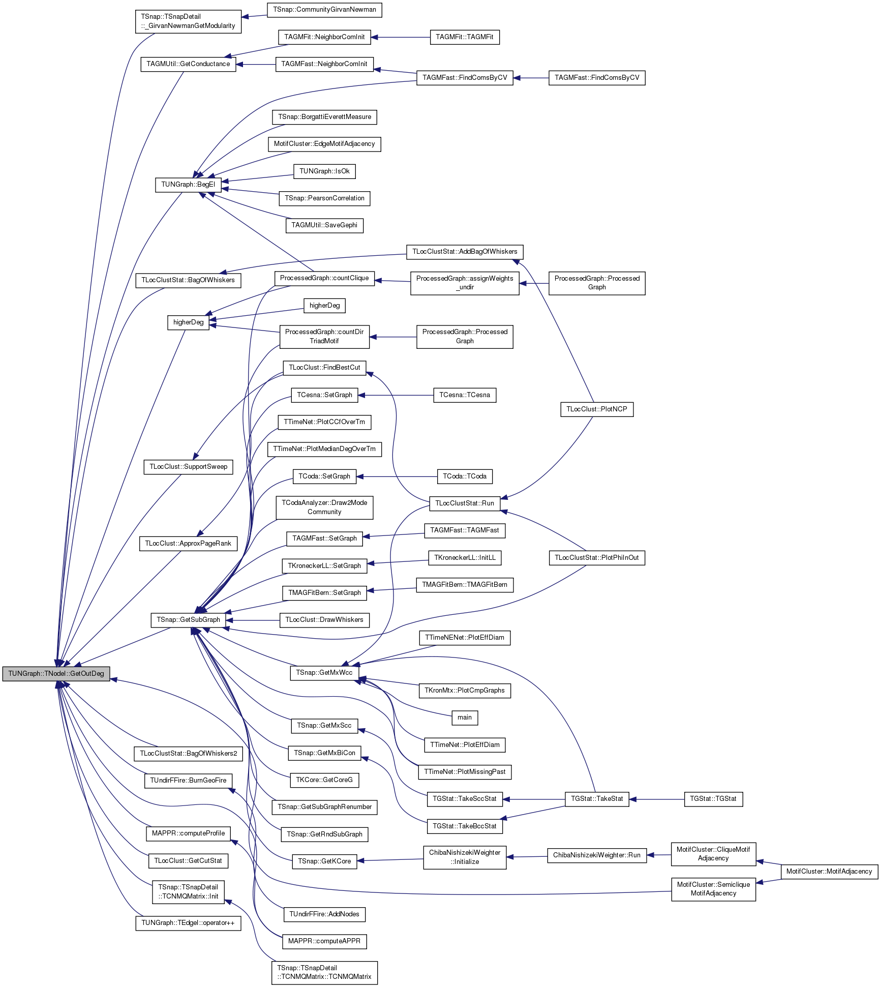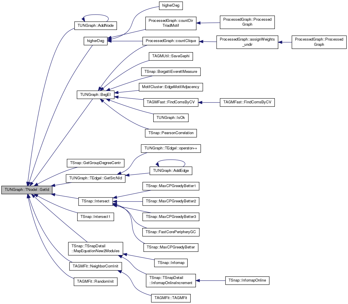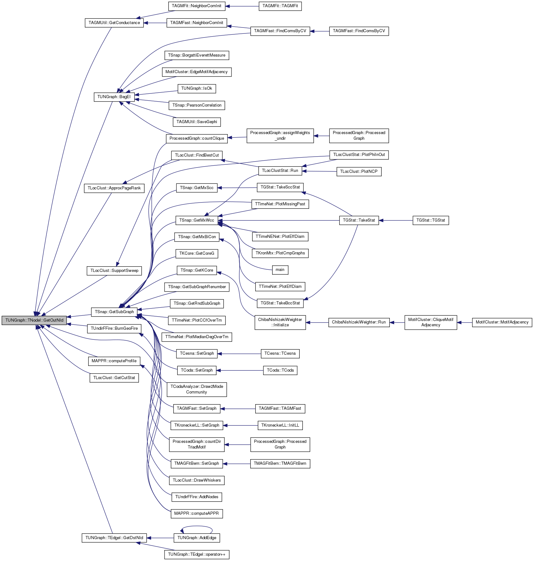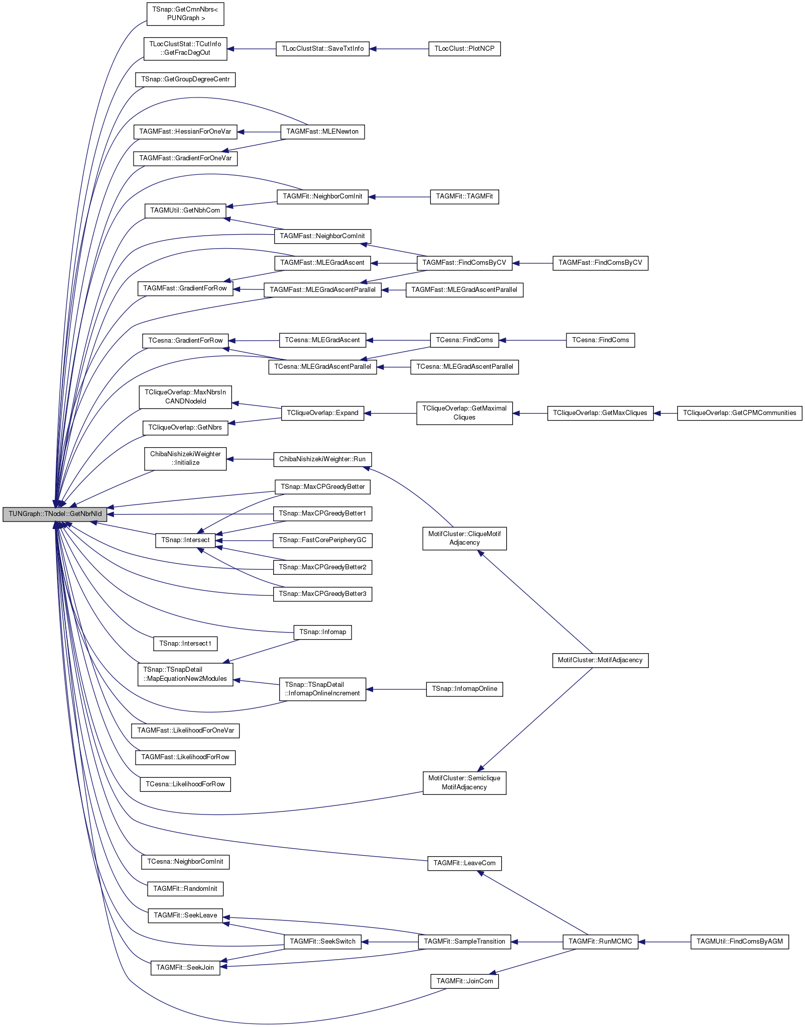 Referenced by TSnap::GetCmnNbrs< PUNGraph >(), TLocClustStat::TCutInfo::GetFracDegOut(), TSnap::GetGroupDegreeCentr(), TAGMUtil::GetNbhCom(), TCliqueOverlap::GetNbrs(), TAGMFast::GradientForOneVar(), TAGMFast::GradientForRow(), TCesna::GradientForRow(), TAGMFast::HessianForOneVar(), TSnap::Infomap(), TSnap::TSnapDetail::InfomapOnlineIncrement(), ChibaNishizekiWeighter::Initialize(), TSnap::Intersect(), TSnap::Intersect1(), TAGMFit::JoinCom(), TAGMFit::LeaveCom(), TAGMFast::LikelihoodForOneVar(), TAGMFast::LikelihoodForRow(), TCesna::LikelihoodForRow(), TSnap::TSnapDetail::MapEquationNew2Modules(), TSnap::MaxCPGreedyBetter(), TSnap::MaxCPGreedyBetter1(), TSnap::MaxCPGreedyBetter2(), TSnap::MaxCPGreedyBetter3(), TCliqueOverlap::MaxNbrsInCANDNodeId(), TAGMFast::MLEGradAscent(), TAGMFast::MLEGradAscentParallel(), TCesna::MLEGradAscentParallel(), TAGMFast::MLENewton(), TAGMFast::NeighborComInit(), TAGMFit::NeighborComInit(), TCesna::NeighborComInit(), TAGMFit::RandomInit(), TAGMFit::SeekJoin(), TAGMFit::SeekLeave(), TAGMFit::SeekSwitch(), and MotifCluster::SemicliqueMotifAdjacency().